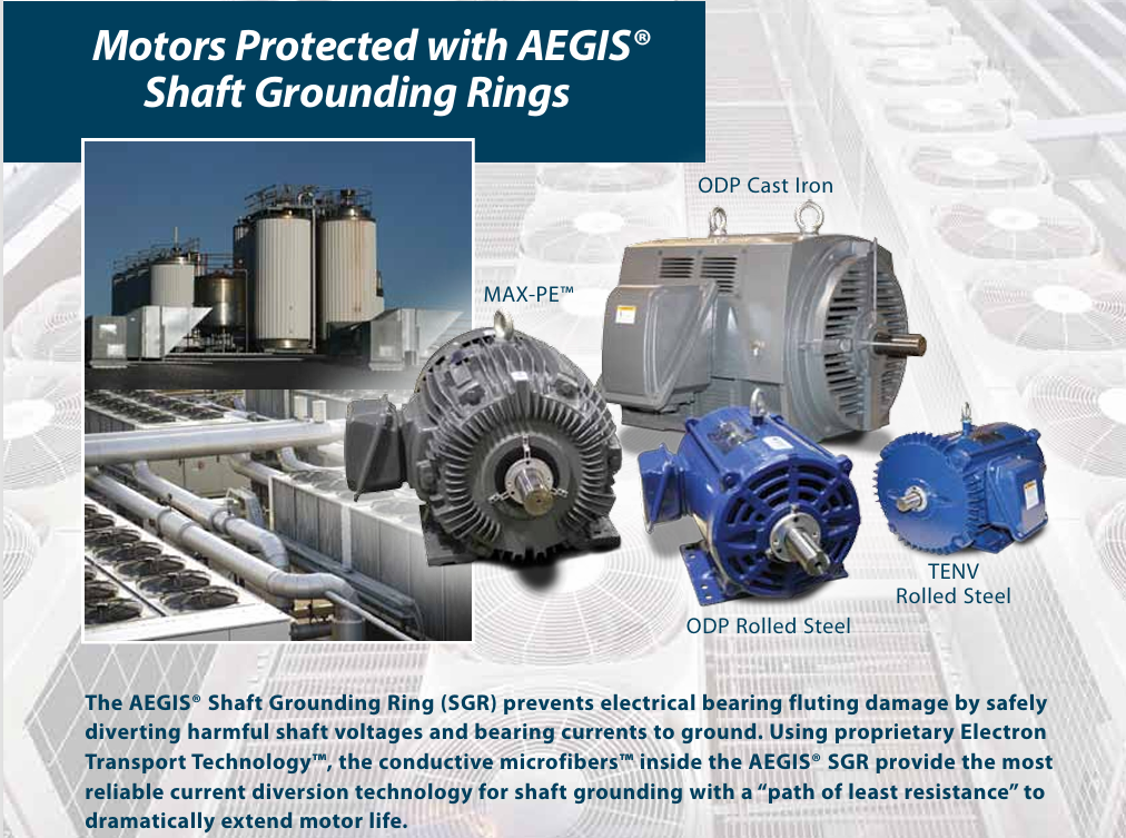 The AEGIS® SGR Bearing Protection Ring aids in preventing electrical bearing “fluting”damage by safely diverting harmful shaft voltages and bearing currents to ground. Using proprietary Electron Transport Technology™, the conductive microfibers inside the AEGIS® SGR provide reliable current diversion technology for shaft grounding with a “path of least resistance” to dramatically extend motor life.