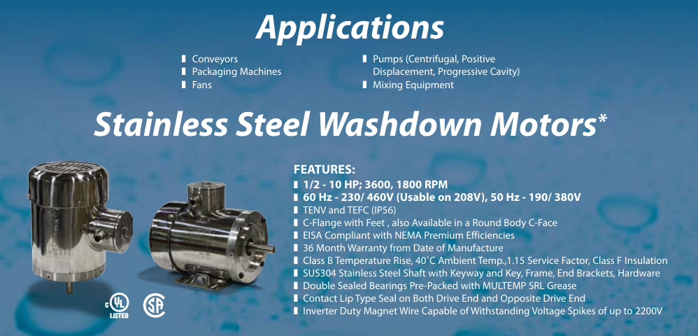Any Application Where the Motor Will be Subjected to High Pressure Spray Down, Marine Duty, Food Processing and Packaging